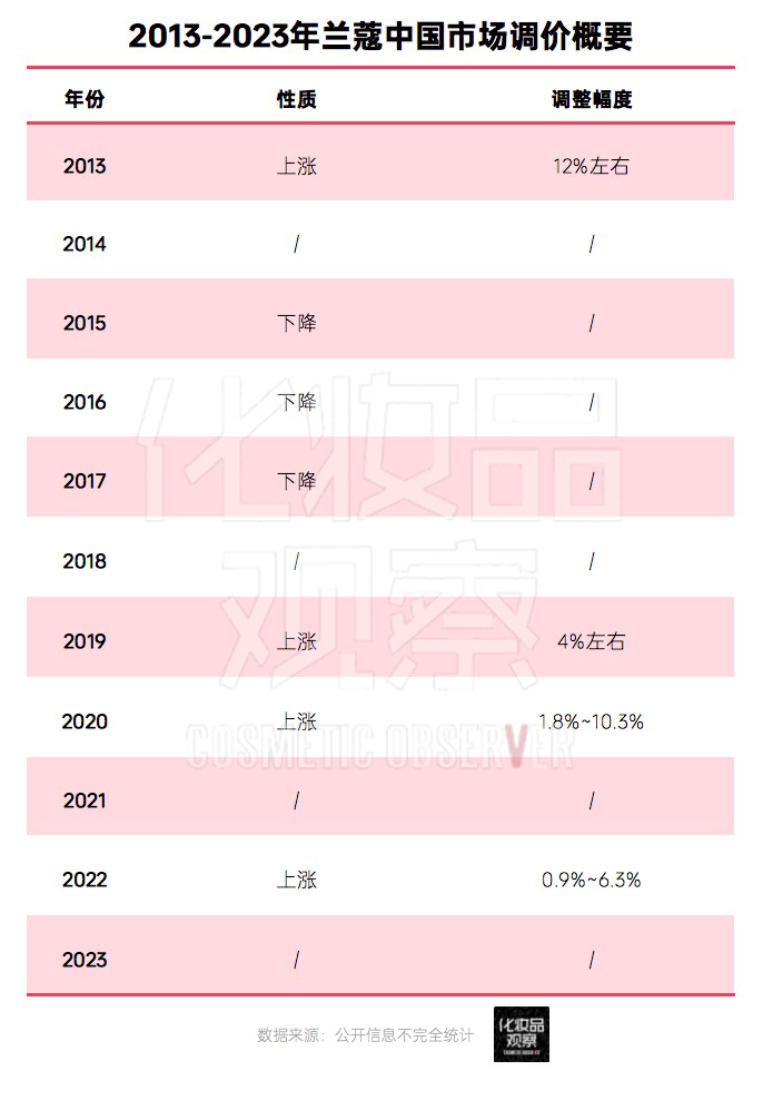 而此前已往十年,《化妆品不雅察》统计,兰蔻品牌为1~2年调价一次。